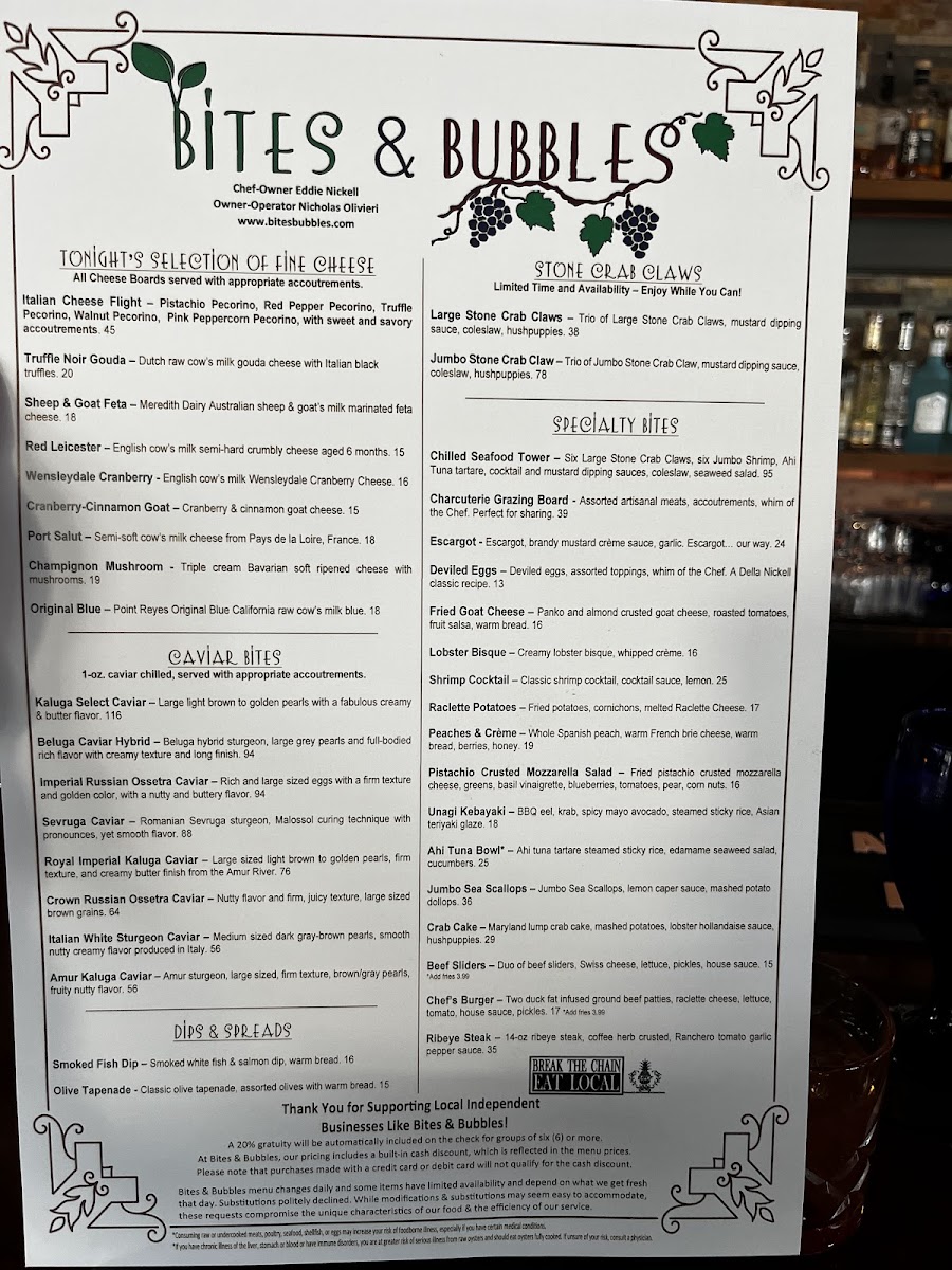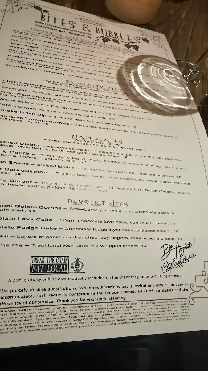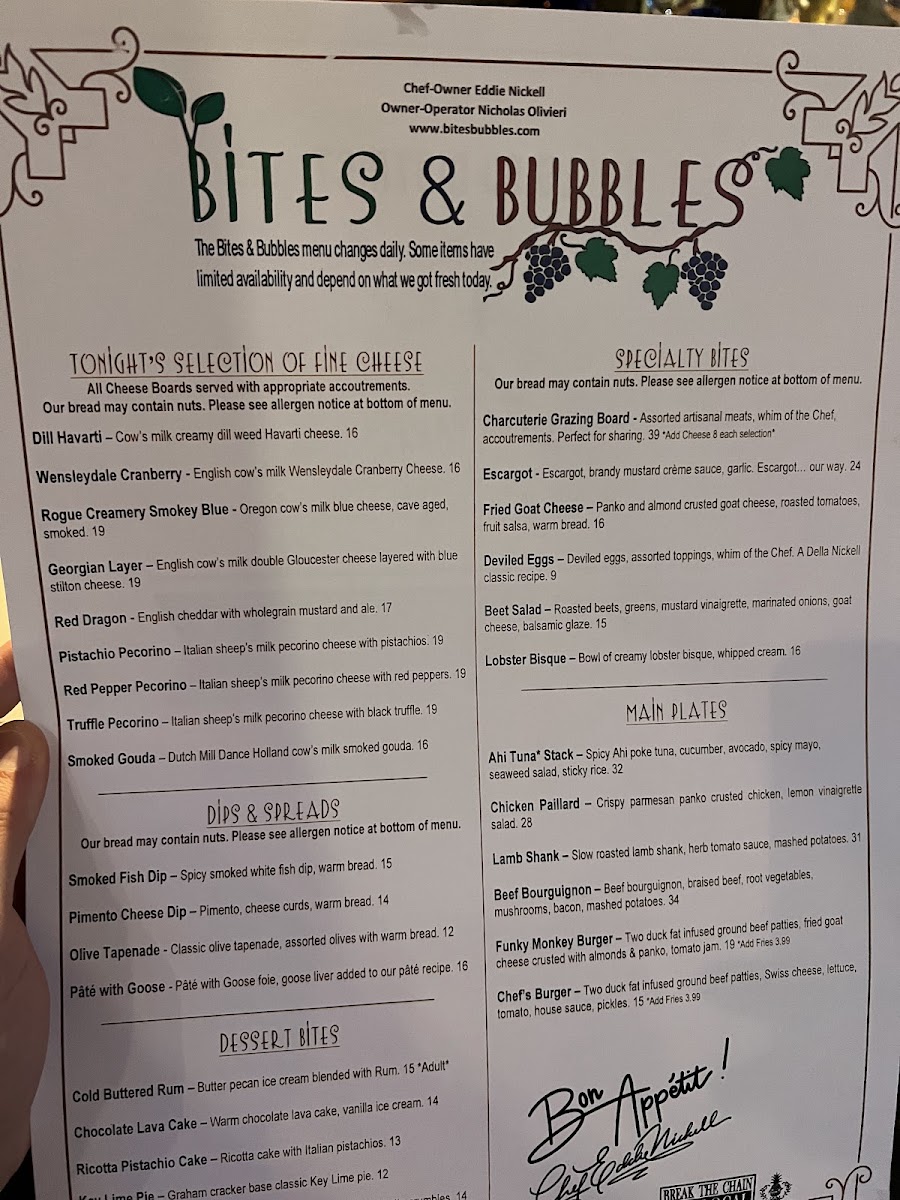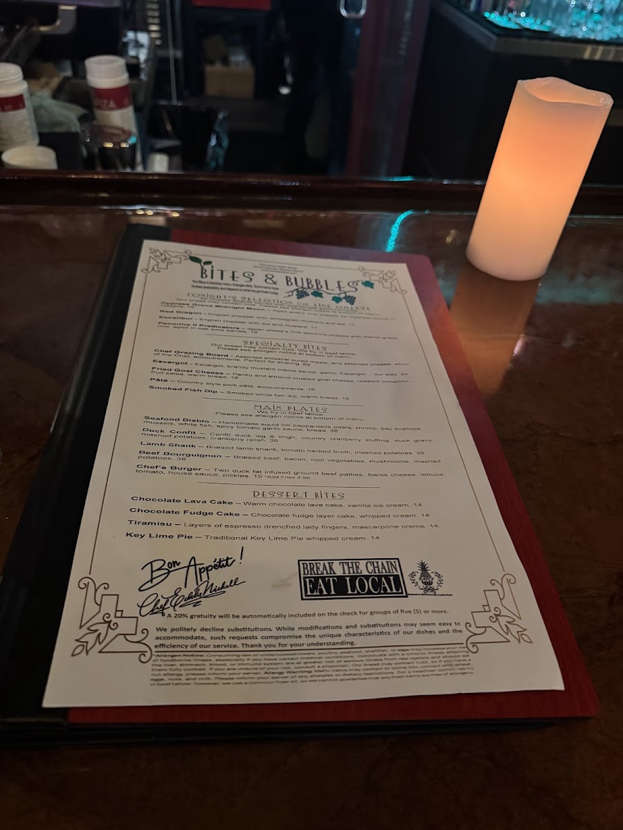 From a reviewer’s perspective, the menu at Bites & Bubbles feels like a carefully curated celebration of comfort, indulgence, and thoughtful pairings, perfectly suited to its intimate location in Orlando. The experience begins with refined appetizers such as Escargot, Fried Goat Cheese, and Smoked Fish Dip or Pâté, which immediately set a European-inspired tone while remaining approachable. Moving into the heart of the menu, the main offerings-Lamb Shank, Beef Bourguignon, Seafood Diablo, and Duck Confit-showcase slow-cooked depth and classic technique, balanced by more modern plates like the Ahi Tuna Stack, Chicken Paillard, and the playful Funky Monkey Burger. Desserts provide a satisfying finale, with rich and familiar favorites including Chocolate Fudge Cake, Key Lime Pie, and Tiramisu, while smaller indulgences like Oni Gelato Bomba, Plate Lava Cake, and Plate Fudge Cake Me Pie allow guests to sample sweetness without overcommitting. The beverage program complements the food seamlessly: signature cocktails such as The Martini Triangle, B&B G&T, Rosie Cheeks, Leu Garden Collins, and Nick’s Dilemma add personality, while an expansive wine list-from Dolly Chardonnay by Dolly Parton and Cakebread Family Chardonnay to reds like Highlands 41 Cabernet Sauvignon, Trapiche Malbec, and Dolly Pinot Noir by Dolly Parton-ensures there is a perfect pairing for every plate. Cheese and charcuterie lovers are equally well cared for with options like the Chef Grazing Board, Charcuterie & Cheese Grazing Board, and selections including Dill Havarti, Wensleydale Cranberry, and Rogue Creamery Smokey Blue, while elevated extras such as Amur Kaluga Caviar, Olive Tapenade, and Pimento Cheese Dip reinforce the restaurant’s upscale yet relaxed identity. Overall, the menu feels cohesive and indulgent without being overwhelming, leaving the impression that Bites & Bubbles is not just about individual dishes, but about creating a complete, well-rounded dining experience from the first bite to the last sip.