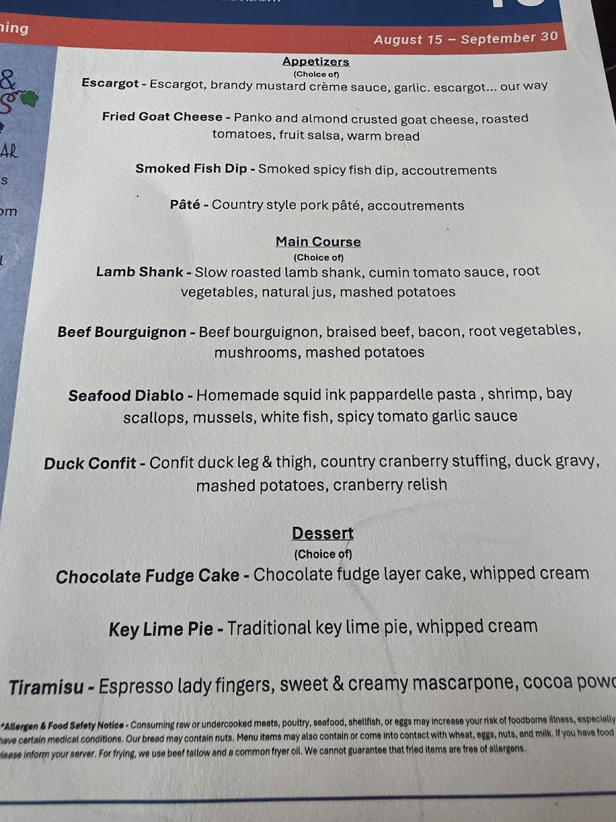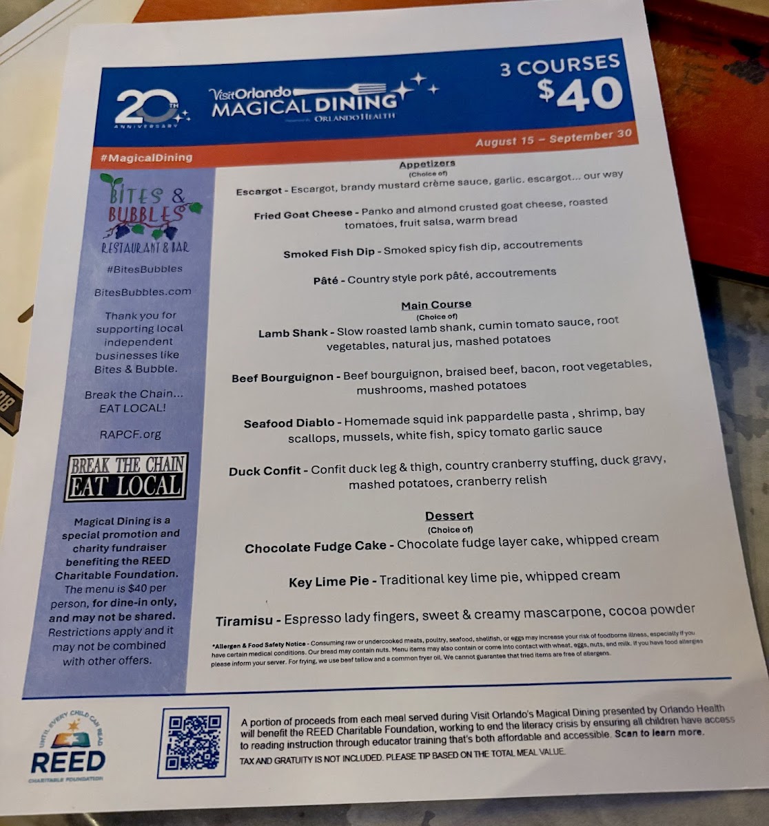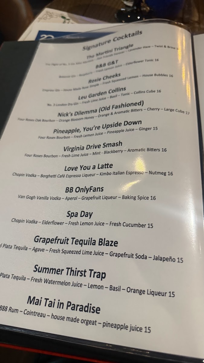 From a reviewer’s perspective, the menu at Bites & Bubbles feels like a carefully curated celebration of comfort, indulgence, and thoughtful pairings, perfectly suited to its intimate location in Orlando. The experience begins with refined appetizers such as Escargot, Fried Goat Cheese, and Smoked Fish Dip or Pâté, which immediately set a European-inspired tone while remaining approachable. Moving into the heart of the menu, the main offerings-Lamb Shank, Beef Bourguignon, Seafood Diablo, and Duck Confit-showcase slow-cooked depth and classic technique, balanced by more modern plates like the Ahi Tuna Stack, Chicken Paillard, and the playful Funky Monkey Burger. Desserts provide a satisfying finale, with rich and familiar favorites including Chocolate Fudge Cake, Key Lime Pie, and Tiramisu, while smaller indulgences like Oni Gelato Bomba, Plate Lava Cake, and Plate Fudge Cake Me Pie allow guests to sample sweetness without overcommitting. The beverage program complements the food seamlessly: signature cocktails such as The Martini Triangle, B&B G&T, Rosie Cheeks, Leu Garden Collins, and Nick’s Dilemma add personality, while an expansive wine list-from Dolly Chardonnay by Dolly Parton and Cakebread Family Chardonnay to reds like Highlands 41 Cabernet Sauvignon, Trapiche Malbec, and Dolly Pinot Noir by Dolly Parton-ensures there is a perfect pairing for every plate. Cheese and charcuterie lovers are equally well cared for with options like the Chef Grazing Board, Charcuterie & Cheese Grazing Board, and selections including Dill Havarti, Wensleydale Cranberry, and Rogue Creamery Smokey Blue, while elevated extras such as Amur Kaluga Caviar, Olive Tapenade, and Pimento Cheese Dip reinforce the restaurant’s upscale yet relaxed identity. Overall, the menu feels cohesive and indulgent without being overwhelming, leaving the impression that Bites & Bubbles is not just about individual dishes, but about creating a complete, well-rounded dining experience from the first bite to the last sip.